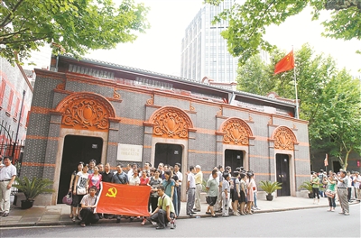 下图:游客在上海中共一大会址前合影留念。(资料图片)