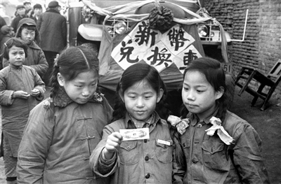 1955年2月21日,国务院发布关于发行第二套人民币和收回第一套人民币的命令,这是天津郊区农村的孩子们在观看兑换来的新人民币。(资料图片)