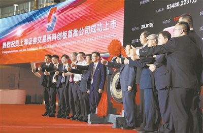 2019年7月22日上午9点30分许,伴随开市锣声的响起,首批25只科创板股票在上海证券交易所上市交易,科创板正式开市,这是上市企业代表在台上合影。新华社记者 方喆 摄