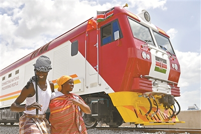蒙内铁路是肯尼亚自独立以来最大的基础设施工程,项目累计为当地直接创造逾4.6万个工作岗位。这是2017年1月11日,在肯尼亚蒙巴萨,当地民众在中国承制的蒙内铁路首批内燃机车旁载歌载舞。新华社记者 孙瑞博 摄
