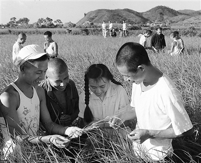 湖南省浏阳县大瑶人民公社沙螺大队党总支书记杨宏典,在领导群众生产中,善于走群众路线,很快就改变了这个生产队的穷困面貌。这是1959年10月,杨宏典和生产队的队长们在田间总结晚稻丰产的经验。(新华社记者 王平 摄)