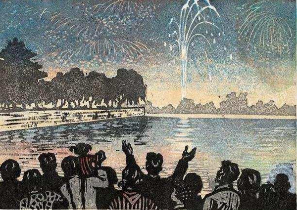 作品表现的是在湖边远观国庆夜的画面。前景是一组处于逆光中欢呼的人群,中景是河岸树林的剪影以及映着欢庆焰火的水面,远景是划过天空的焰火,与人群的表情、姿态、手势相呼应。作品形式简洁,但极具感染力。