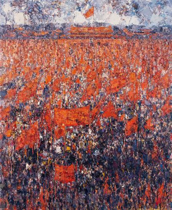 作品采取群众面向观礼台方向的视角,将主体人物选定为观礼的群众。涌动的人潮,飘动的旗帜,斑驳的色彩,灵动的用笔,表现了国庆场面的热烈与恢宏。