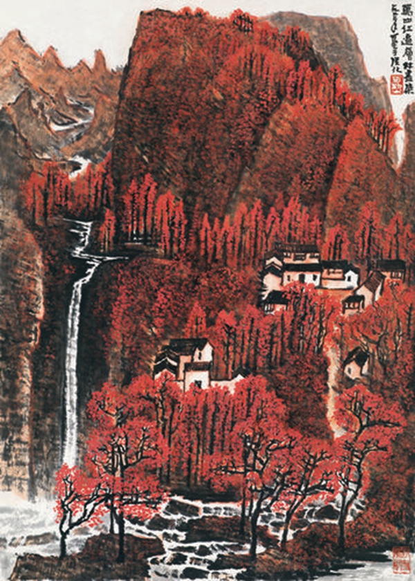 画作献礼新中国成立15周年,是根据《沁园春·长沙》所作。“万山红遍,层林尽染”,造了一个艺术世界,在黑红对比中写南国深秋景色,带有理想化的诗意色彩。(中央纪委国家监委网站 沈东方)