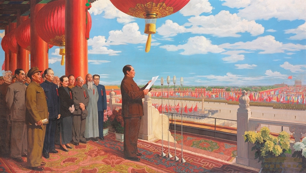 作品描绘了1949年10月1日,毛泽东在天安门城楼上宣读中央人民政府公告,宣告中华人民共和国成立的一刻。在色彩上,红灯笼、红柱子、远处红旗的海洋,与蓝天、白云、绿树和鲜花形成强烈对比,画面热烈而明快,展现出真正的泱泱大国气象。