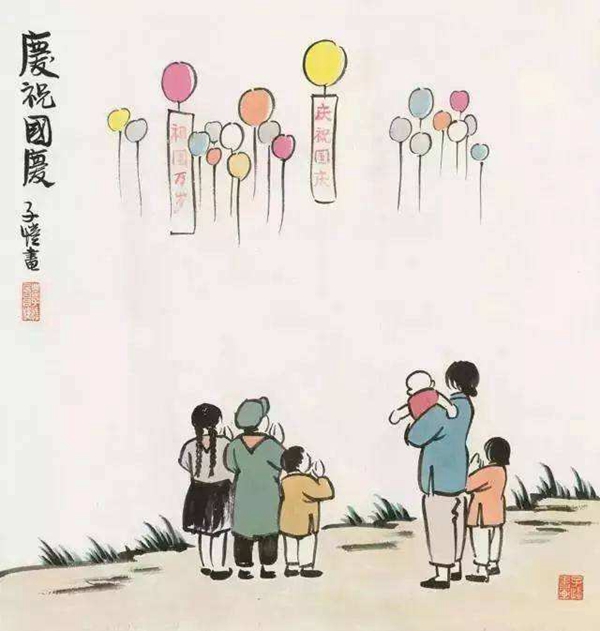 丰子恺记录国庆,画面简单质朴。作品中所有人物都是背影,没有五官细节上的描绘,反而将观众的视线自然地引到五彩的气球上,主题豁然明朗。
