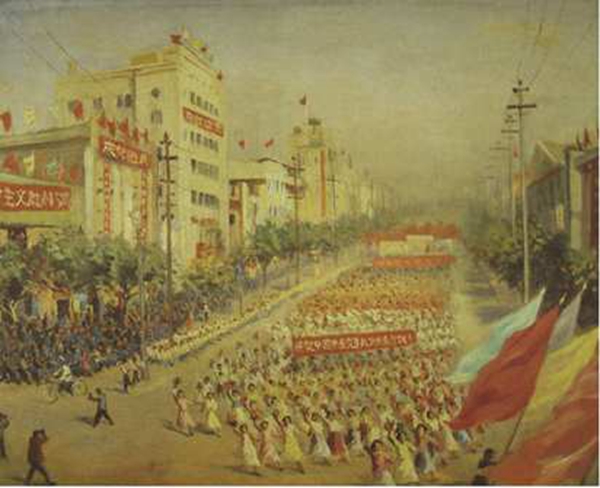画作描绘的是1956年国庆期间,南京广大民众载歌载舞、欢度国庆的壮观游行场景。作品以暖色调为主,通过和煦的阳光普照大地等情境描绘,营造国庆佳节的喜悦气氛。