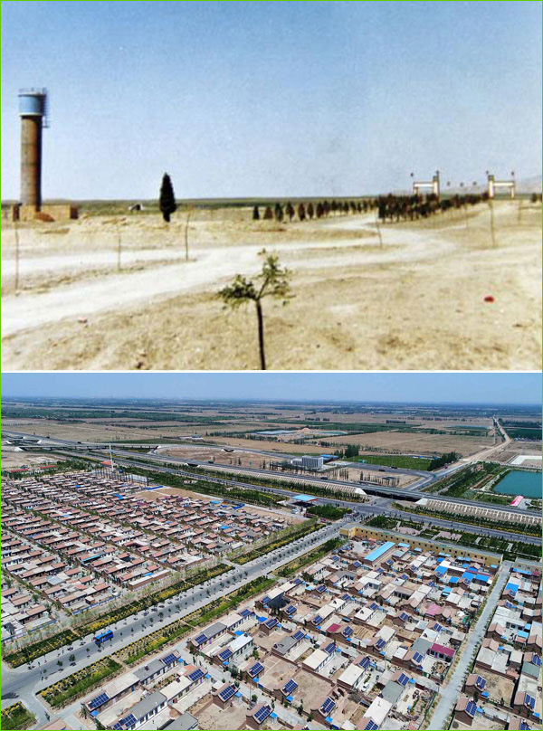 上图为闽宁镇建设初期的资料照片;下图为现在的闽宁镇原隆村全貌