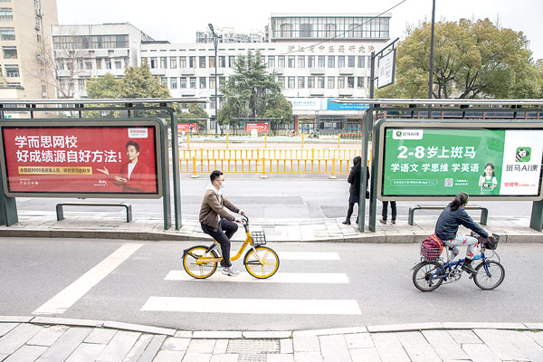2021年3月10日,杭州街头随处可见各类线上教育品牌广告。(图片来源:视觉中国)
