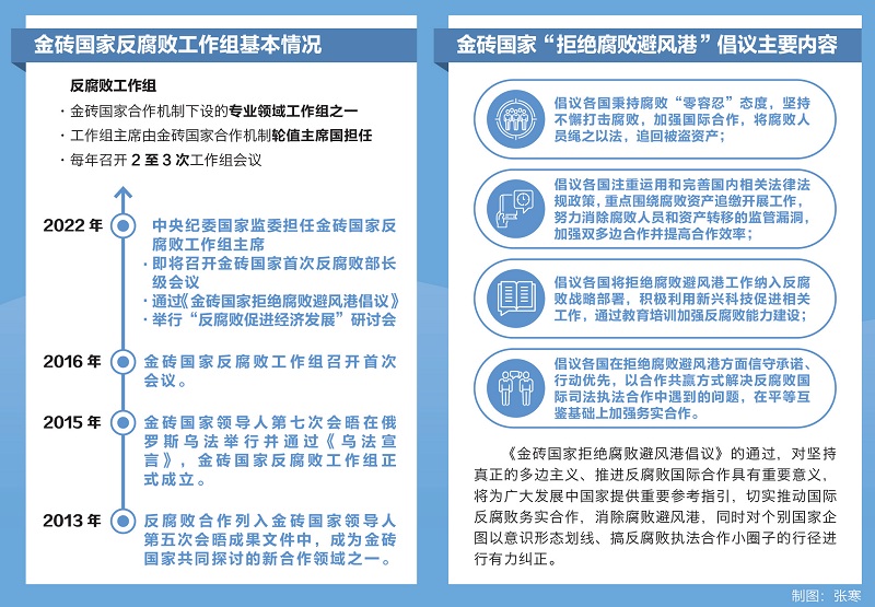 反腐败工作组是金砖国家合作机制下设的专业领域工作组之一,每年召开2至3次工作组会议。中央纪委国家监委代表中方参与金砖国家反腐败合作,积极推动金砖国家在拒绝腐败避风港、反腐败追逃追赃等领域开展合作。
