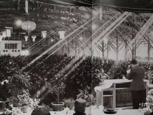 △1957年,学校的大礼堂还没有建成,学校请来工匠用竹子搭建了这座临时“草棚大礼堂”。在很长一段时间里,学校开大会、文艺演出、放电影都在这里进行。