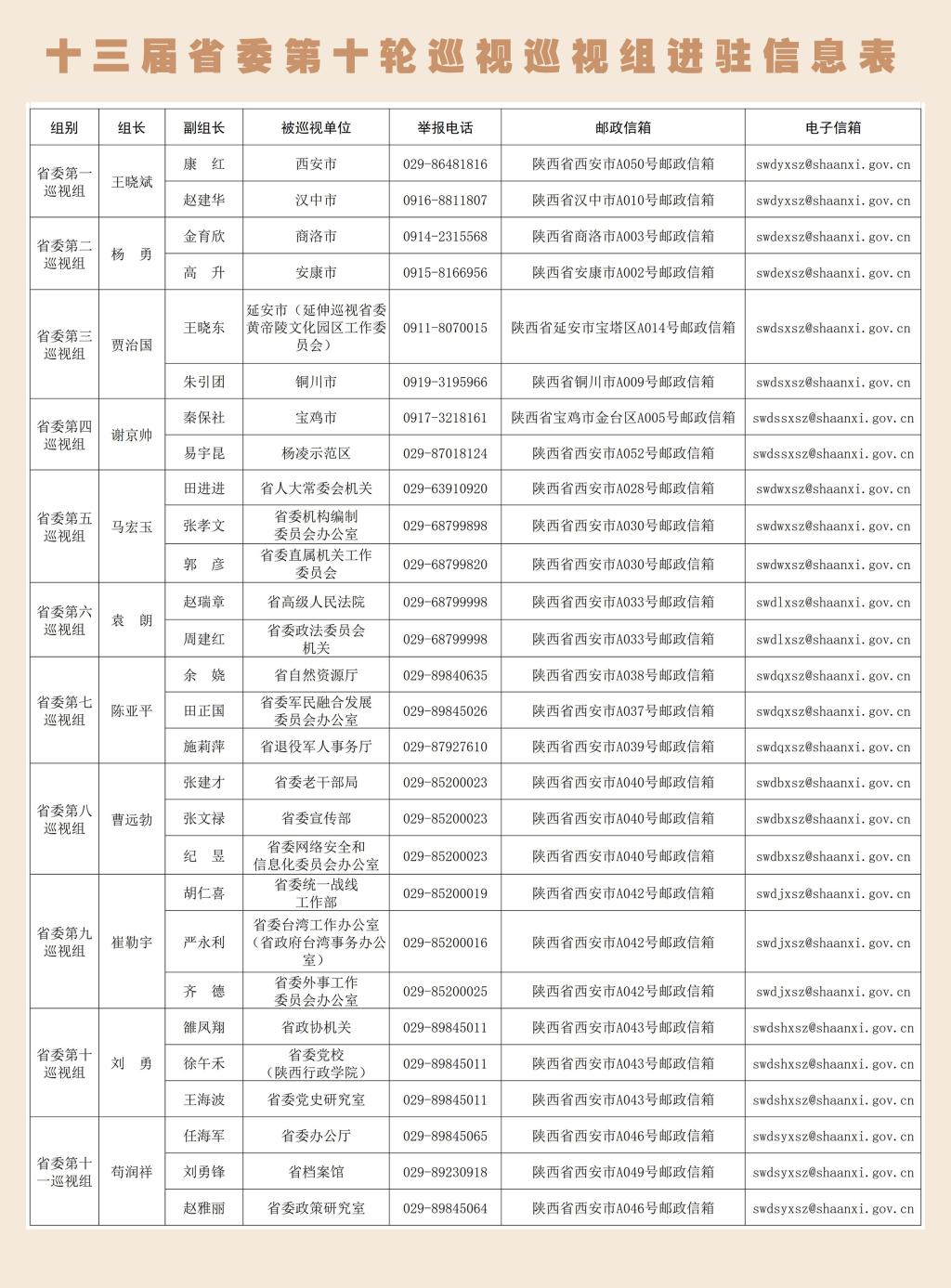 经省委批准,十三届省委第十轮巡视对西安市、宝鸡市、铜川市、延安市、汉中市、安康市、商洛市、杨凌示范区等8个市(区)和省委办公厅、省委宣传部、省委统一战线工作部、省委政法委员会机关、省委政策研究室、省委网络安全和信息化委员会办公室、省委军民融合发展委员会办公室、省委台湾工作办公室(省政府台湾事务办公室)、省委外事工作委员会办公室、省委机构编制委员会办公室、省委直属机关工作委员会、省委老干部局、省委党校(陕西行政学院)、省档案馆、省委党史研究室、省人大常委会机关、省政协机关、省自然资源厅、省退役军人事务厅、省高级人民法院等20个省直部门单位党组织开展常规巡视。期间,延伸巡视省委黄帝陵文化园区工作委员会。